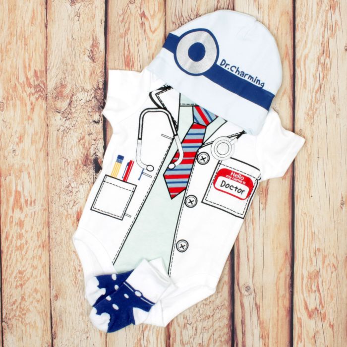 This wonderful 100% Cotton 3pc Dr.Charming Set is the perfect outfit for your little boy. The set includes a body vest with a dr printed design throughout, a hat with a dr.charming moto & matching socks.