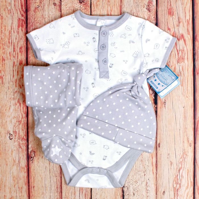This wonderful 100% Cotton 3pc Grey Stars Set is the perfect outfit for your little boy. The set includes grey star elasticated pants, a button t-shirt vest with popper buttons for easy changing & a beautiful floral grey star matching hat.