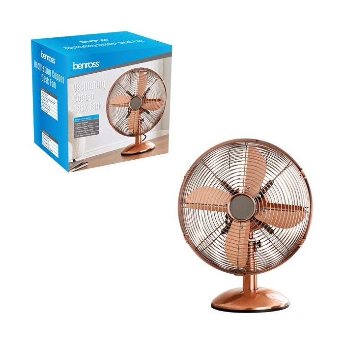 This 12" Copper Desk Fan combines classic styling with modern functionality, making it a great choice for cooling your workspace or home. The fan features a durable metal frame with a copper finish, a 12-inch metal grill, and four aluminium blades for efficient airflow. It offers three speed settings and an oscillating head to distribute air evenly. With a powerful 40W motor and 1.5m power cord with a BS plug, this fan is practical, stylish, and easy to set up.