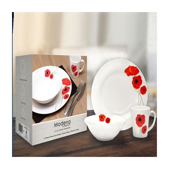 This 12 Piece Dinner Set is adorned in a striking poppy design across the entire set, which includes four plates, four bowls and four mugs for a beautiful matching dining set. For more beautifully designed dining items to compliment this.