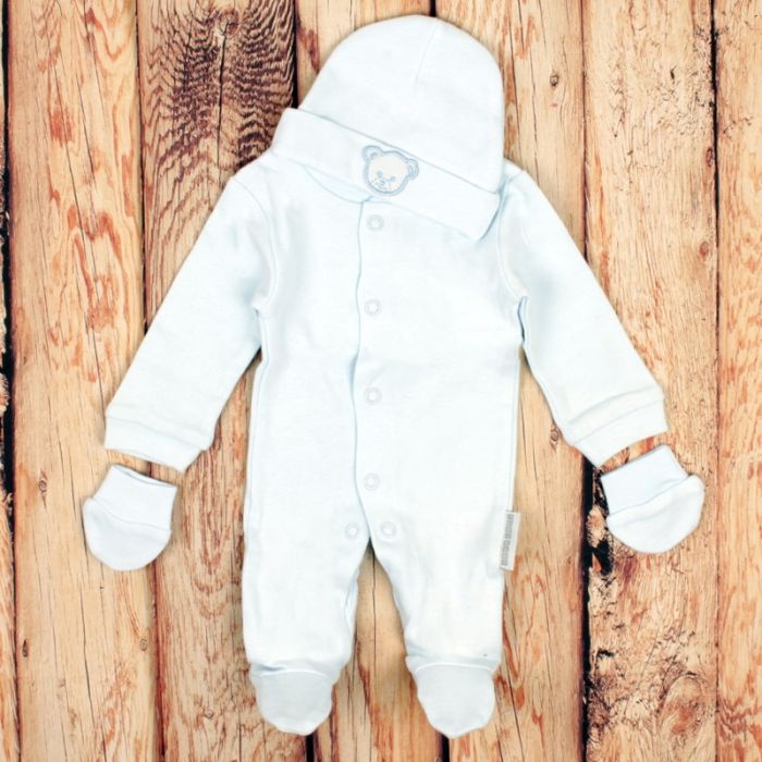 This lovely 3 PC Premature Baby Set is the ideal choice for a gift or for your own little one. The set includes a popper button sleepsuit, a pair of scratch mitts & an embroidered teddy bear hat that are all made from 100% supersoft cotton.