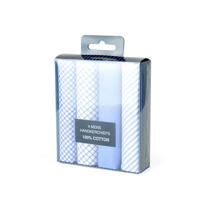 A stylish set of 4 handkerchiefs in various designs, these hankies are made from a soft 100% cotton fabric that can be washed again and again.