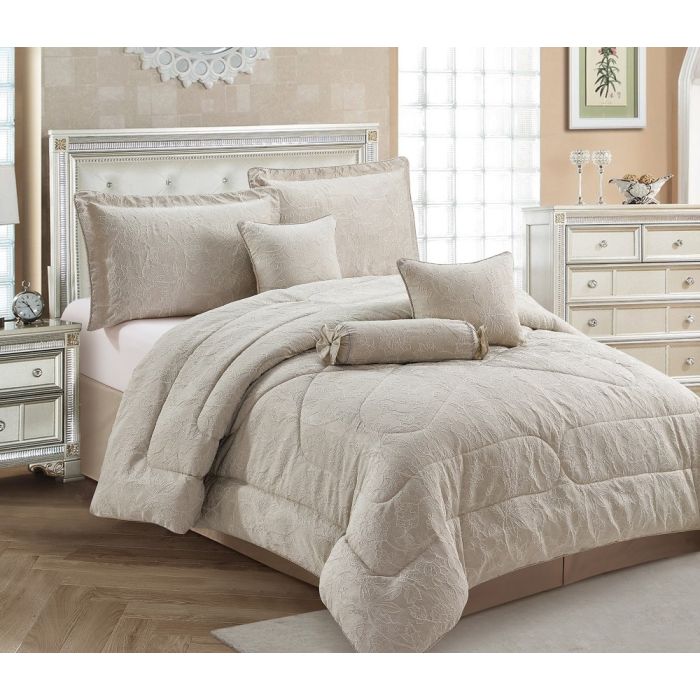 Add comfort and style to your bedroom with the 7 Piece Ellie Bedspread Comforter Set. It features a subtle yet beautiful floral embroidery on a natural background with intricate stitching & matching pillowshams. cushions & covers.