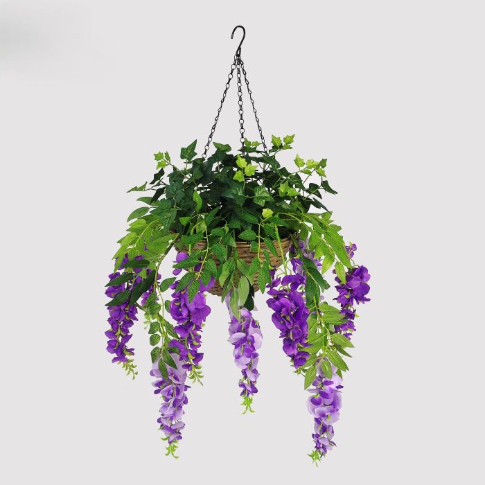 Enhance your home or garden with the elegant charm of this Artificial Wisteria Hanging Basket in a rich Purple hue. This beautifully cascading floral arrangement stands out with its realistic detailing and lush foliage, making it a stunning centerpiece for both indoor and outdoor spaces.
