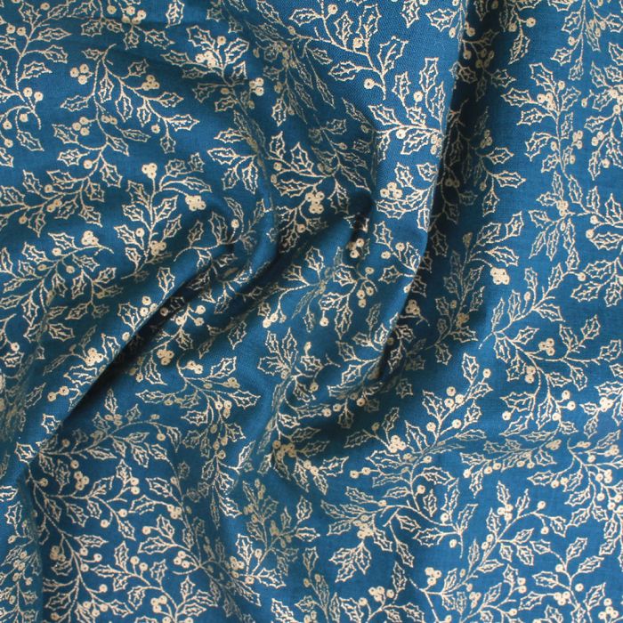 This 100% cotton Christmas fabric is ideal for making cushion covers and much more. It features a gold holly pattern design on a green background.
