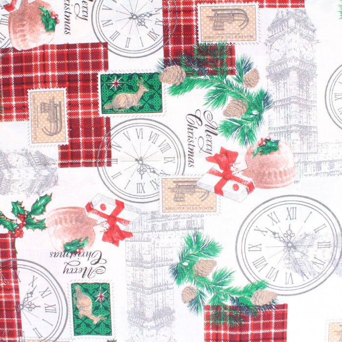 This 100% cotton Christmas fabric is ideal for making cushion covers and much more. It features the big ben with a pudding pattern design on a cream background