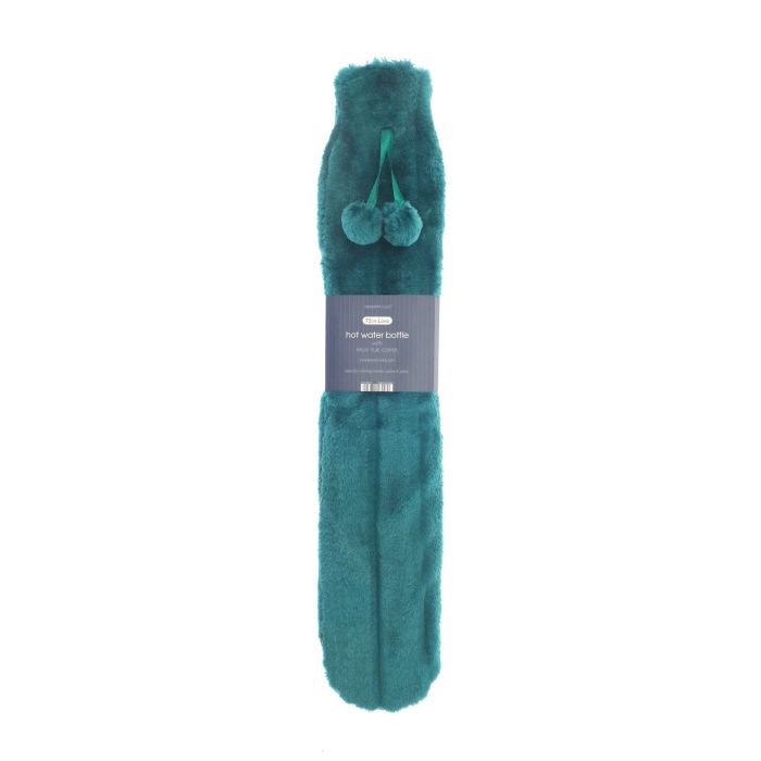 The extra long hot water bottle comes in an on-trend plush faux fur cover with pom poms.