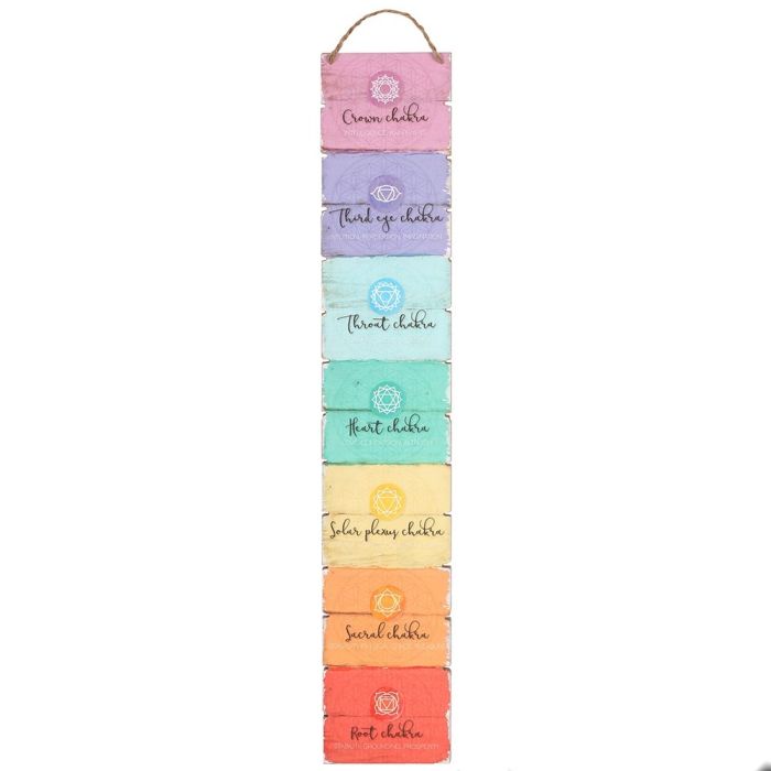 Beautiful wooden wall plaque displaying the Seven Chakras including their colour, symbol and meaning. This plaque has a twine loop reading for hanging.