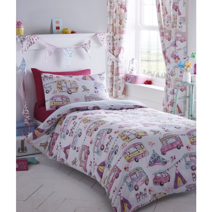 The design of the duvet cover is Glamping which has retro campervan, ice cream van and tent illustrations on it. Material is 50% Cotton & 50% Polyester and it is machine washable.