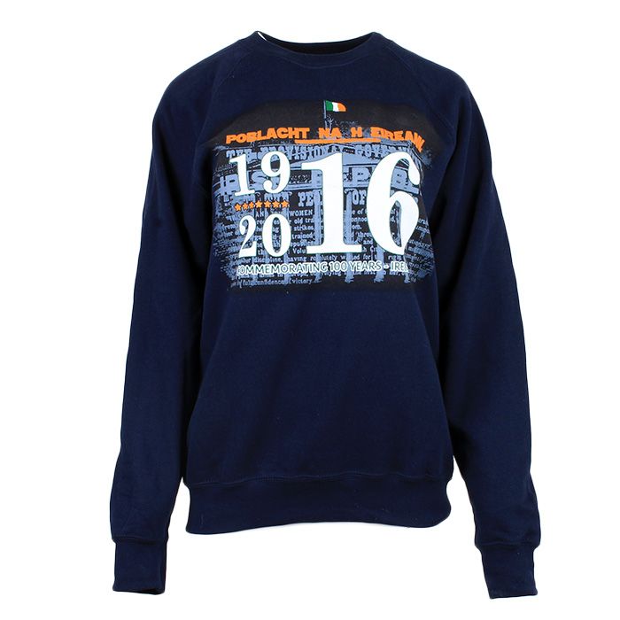 What a great way to commemorate the 1916 centenary. This wonderful fruit of the loom jumper features a round neck with the famous GPO and Proclamation in the background with 1916 - 2016 printed years with POBLACHT NA H EIREANN and Commemorating 100 years - Ireland printed motifs.