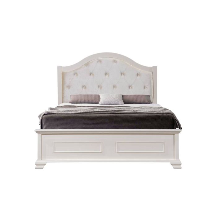 - Plush cream fabric upholstery with an elegant button tufted headboard