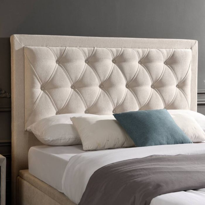 The Lily wingback headboard features elegant button tufting, soft linen upholstery, and a sculpted silhouette that enhances any bedroom with refined comfort.