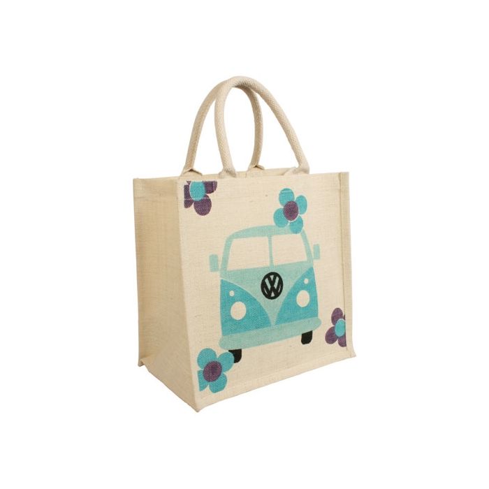 Jute eco shopper hand-screen printed in Kolkata, India. Blue campervan and flowers design Padded handles Jute is the second most important vegetable fibre after cotton and is a light, soft, shiny plant fibre that can be spun into coarse, strong threads. Jute is 100% bio-degradable and recyclable and thus environmentally friendly. Dimensions: 30x30x20cm Handle length: 36cm Made in India