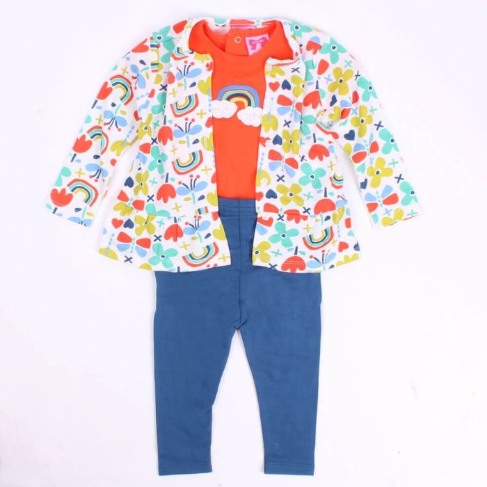 This cute 3 piece Jacket and Bottom set is perfect for your little one. Made from 100% cotton, the set features a beautiful floral lightweight jacket with buttons, orange short sleeve bodysuit & coordinating leggings. Perfect as a gift too.