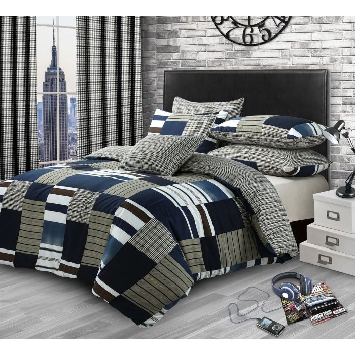 This duvet cover features a patchwork design. It has denim, check, herringbone and blocks of colour printed to create the design. The reverse of the duvet cover is the same check that is on the patchwork design. The matching pillowcase has the same design, with patchwork on one side and check on the reverse.