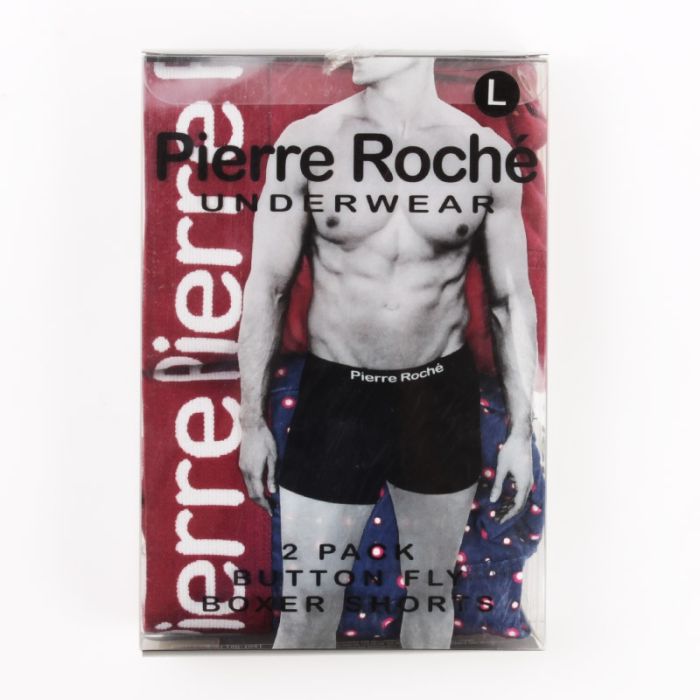 - Button Fly: Buttoned boxer shorts, 2 pairs in box - 1 printed and 1 plain, contrasting elasticated waistband with Pierre Roche branding.