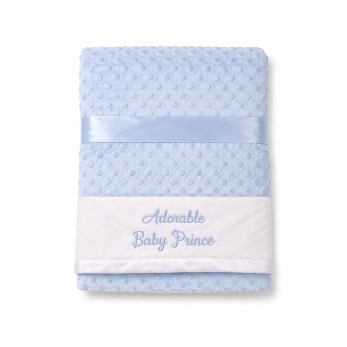 Wrap your baby in softness with the Plush Baby Blanket Prince Blue, made from 100% polyester for a gentle and cosy feel. Featuring a charming light blue design with a soft minky texture and elegant “Adorable Baby Prince” embroidery, this 75x90cm blanket is perfect for cots, prams, or everyday comfort. Lightweight yet warm, it’s an ideal choice for keeping your little one snug while adding a stylish touch to any nursery.