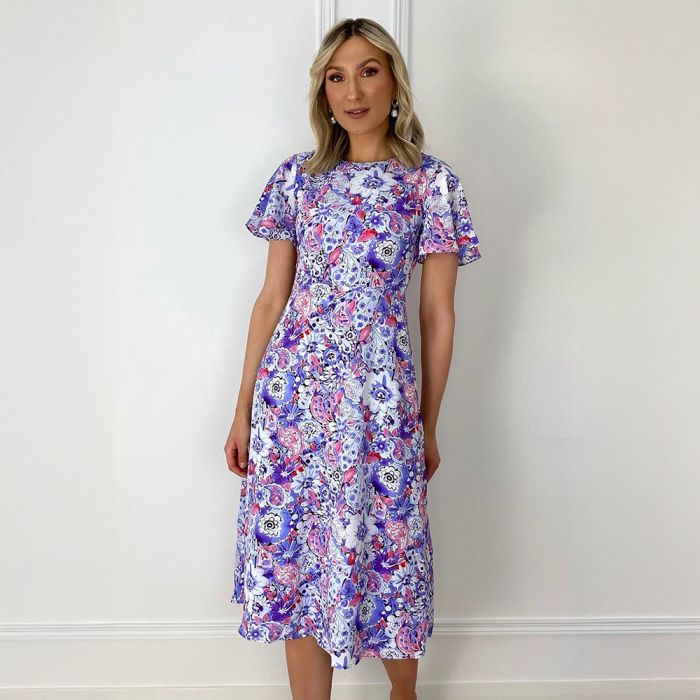Step into timeless elegance with our Women's Purple Floral Dress. Featuring a charming mix of purple, pink, and soft white florals, this dress flows beautifully with every step. The flattering A-line silhouette and flutter sleeves add a romantic touch, making it perfect for garden parties, brunches, or special occasions.