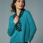Make a statement with this Women's Scarf Jumper in vibrant teal, featuring a chic leopard print scarf attached. This plain jumper combines warmth and style with its soft, cozy fabric, perfect for layering on cooler days. The attached leopard print scarf adds a unique and trendy touch, making this jumper an ideal choice for casual and smart-casual outfits.
