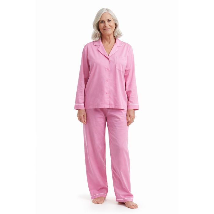 Soft and breathable 100% cotton pink pyjamas designed for all-night comfort with a classic, cosy feel.